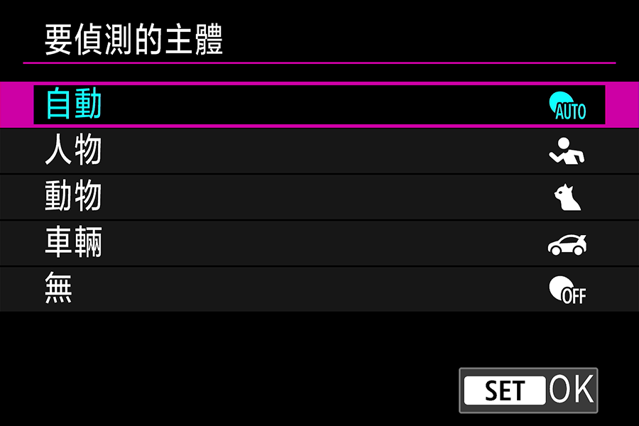 自動偵測主體能自動偵測及選擇人物、動物或車輛作為主體,方便用家拍攝人物、動物及車輛時無需考慮設定。