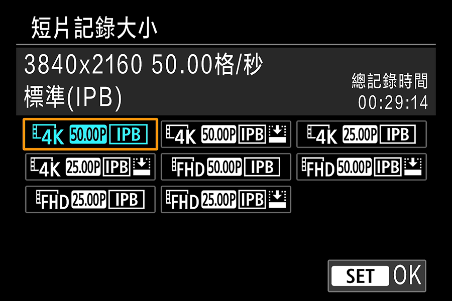 4K UHD (59.94 / 50.00fps / 29.97 / 25.00  / 23.98fps) / IPB (輕量)