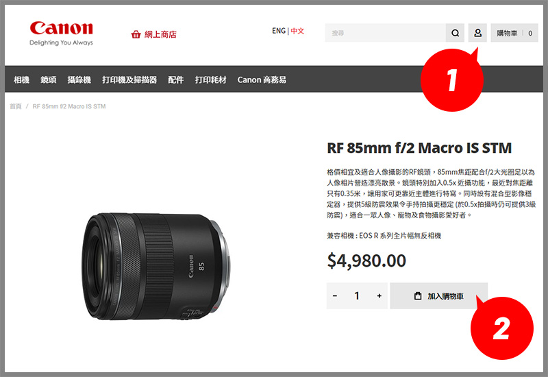 - 如果您是 Club Canon 會員,可於網頁右上方先登入您的帳戶。