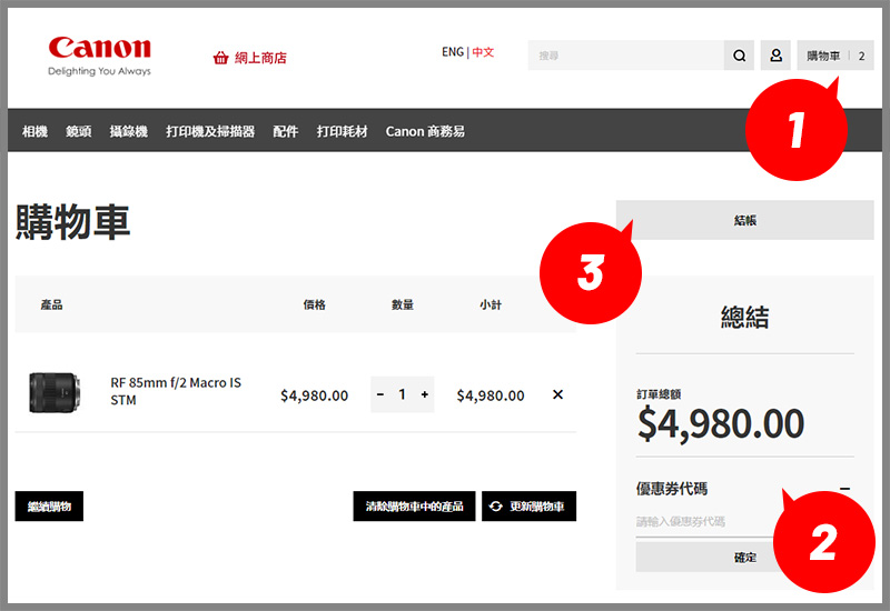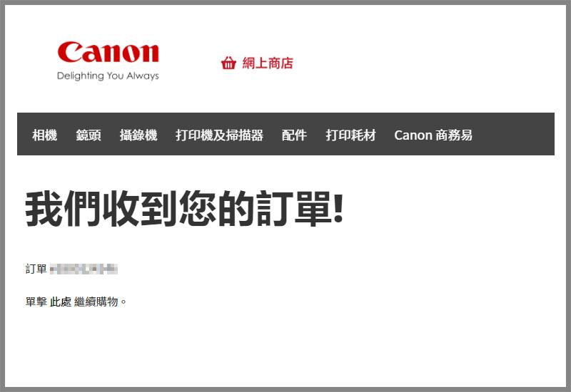 - 成功付款後,系統會自動轉跳回 Canon 網上商店