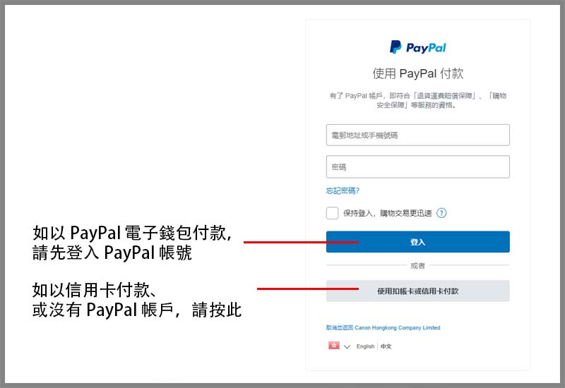 - 香港客戶:系統會自動轉跳到 PayPal 網站。您可選擇以信用卡或以 PayPal 電子錢包付款。